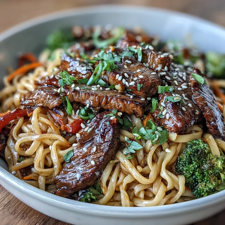 Pin it My neighbor came back from Seoul with a jar of something dark and sweet, insisting I toss it with whatever I had in the fridge. I didnt have her mystery paste, but I did have soy sauce, brown sugar, and a hunk of flank steak that needed using. What came together that night, slippery noodles clinging to caramelized beef and charred vegetables, became my weekly reset meal. The kitchen smelled like a street cart, and I ate straight from the skillet.