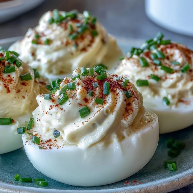Pin it The butter-yellow yolk mixture sat in the bowl like silk, and I knew right then this wasn't going to be just another deviled egg. My sister had texted me the night before, saying she was bringing 'the fancy ones' to our potluck, which lit a competitive fire I didn't know I had. I whipped cream cheese into the filling for the first time, and the texture changed everything. The tangy bite of Dijon against that velvety richness made me taste it three times before I even filled the first egg. By the time I set the platter down, people were already reaching.