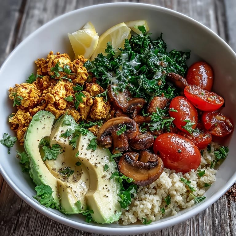 This breakfast bowl is inspired by modern American cuisine, offering a fresh take on traditional scramble dishes. The combination of smoked paprika and nutritional yeast gives the tofu a deeply savory profile that complements the garlicky mushrooms and wilted kale beautifully.
