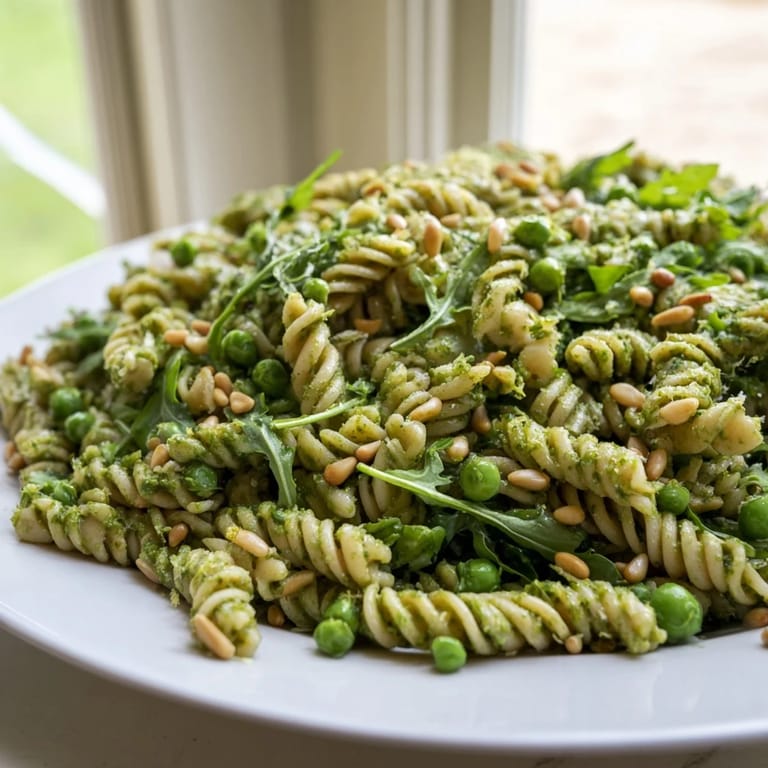 I brought this to a friends birthday picnic last May and watched three different people ask for the recipe before they even finished their first servings. Something about the peppery arugula mixed with sweet peas and that nutty pesto just makes people happy.