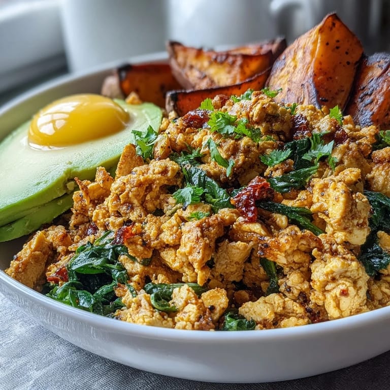 This is one of those breakfast recipes that actually improves with planning—you can make the tofu scramble and roasted sweet potatoes the night before, store them separately, and reheat everything gently in the morning. The quinoa stores beautifully for days, and assembling your bowl takes maybe two minutes when everything's ready. Save the avocado and fresh herbs for the morning though; avocado turns brown and herbs go limp if they sit too long.
